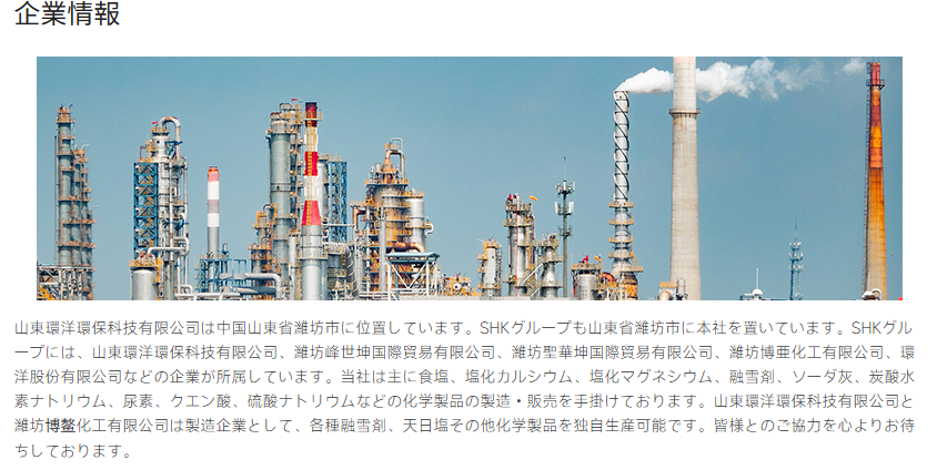 The group is mainly engaged in the production and sales of chemical products,such as salt, calcium chloride, magnesium chloride, snow melting agent, soda ash, baking soda, urea, citric acid, and sodium sulfate etc. Shandong Huanyang Environmental Protection Technology Co., Ltd. and Weifang Boao Chemical Co., Ltd. are production-oriented enterprises that can independently produce various deicing agent ,solar salt and other chemical products.